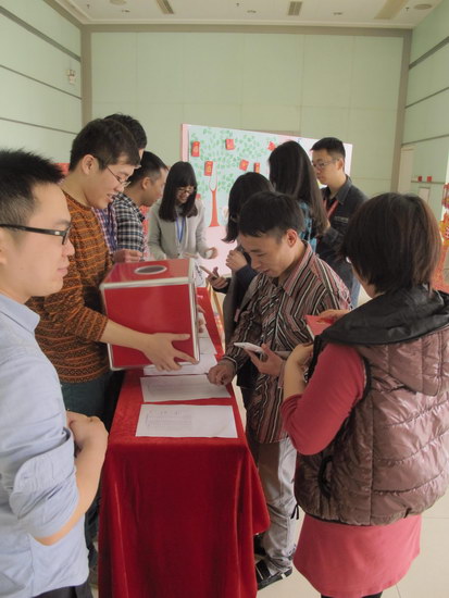 2015年2月26日,潘高壽羊年開(kāi)工第一天,公司團(tuán)委組織策劃“潘高壽團(tuán)員賀年活動(dòng)——2015年開(kāi)工大吉,高壽青年喜洋洋”活動(dòng),迎接團(tuán)員青年,送上新年祝福。活動(dòng)期間,公司全體團(tuán)員青年都能在活動(dòng)現(xiàn)場(chǎng)抽取一封“大利是”。“大利是”為每一位團(tuán)員青年送上真摯的新春祝福,還代表著公司對(duì)每一位辛勤工作的團(tuán)員青年的關(guān)心。此次活動(dòng),團(tuán)員青年熱情高漲,在領(lǐng)取“大利是”的同時(shí),還寫(xiě)下自己的新年心愿,期望能夠在新一年的工作中取得更好的成績(jī),并祝愿公司業(yè)績(jī)?cè)谛碌囊荒旮弦粚訕牵?/span>